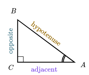Figure 6.3.10. From the perspective of angle \(A\text{,}\) all sides of a right triangle can be labeled.